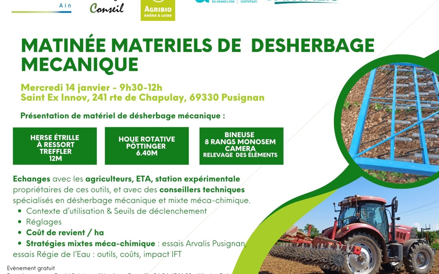 AGRIBIO Rhône et Loire, AlteragroConseil, la FDCUMA de l’Ain, la Régie de l’eau de Lyon et Arvalis s’associent pour proposer une matinée d’échanges techniques autour du désherbage mécanique, le 14 janvier, à St Ex Innov.